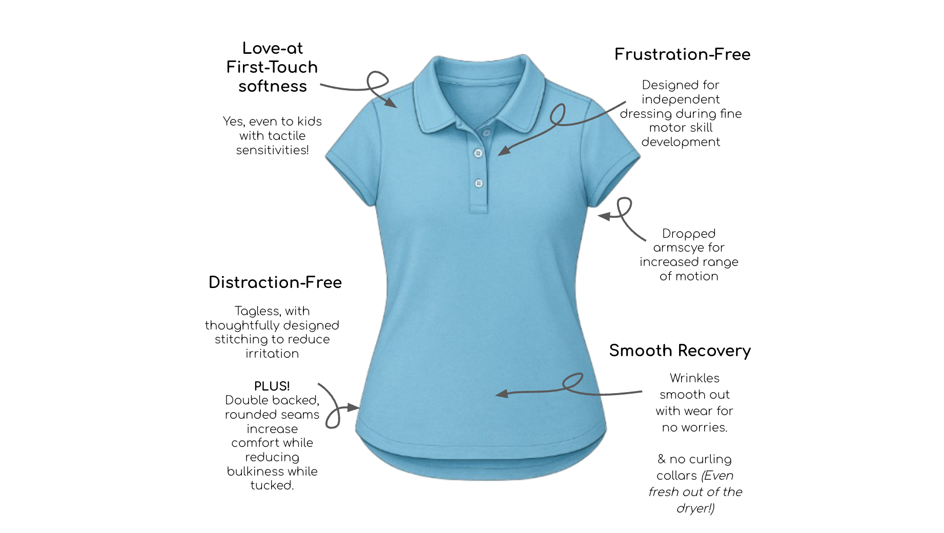 Our girl's polo combines comfort-driven design, distraction free materials, and functional style to empower kids to thrive in every environment- whether it's the classroom, the playground, or beyond.